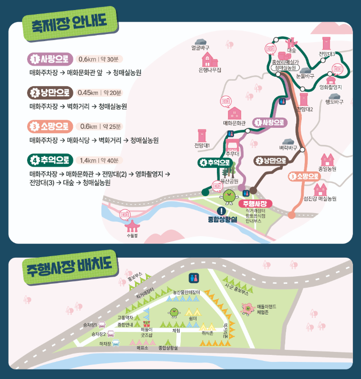 - 공영주차장: 매화문화관 인근 1,300대 수용 가능