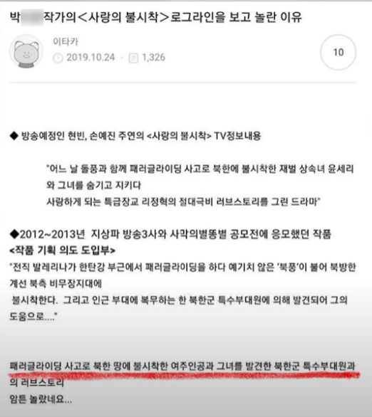 바로 패러글라이딩 불시착으로 인하여 남북남녀의 사랑이야기가 펼쳐지는 핵심 컨셉이 같다라는 주장입니다. 이에 작가 지망생은 박지은 작가의 소속사에게 문의를 하였으나 돌아오는 답변은 법적 조치를 하겠다는 것입니다.