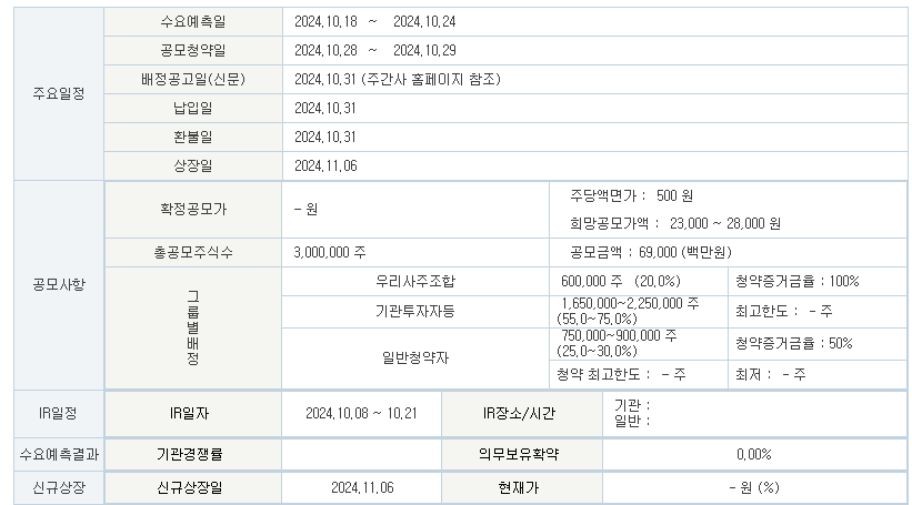 2024년 10월 28일부터 10월 29일까지 더본코리아의 청약이 실시될 예정입니다. 이 기간 동안 투자자들은 원하는 만큼의 주식을 청약할 수 있으며, 청약 후 배정된 주식은 상장일인 11월 6일에 거래가 시작됩니다. 아래 이미지는 공모주 청약 일정과 관련된 정보를 정리한 것입니다.