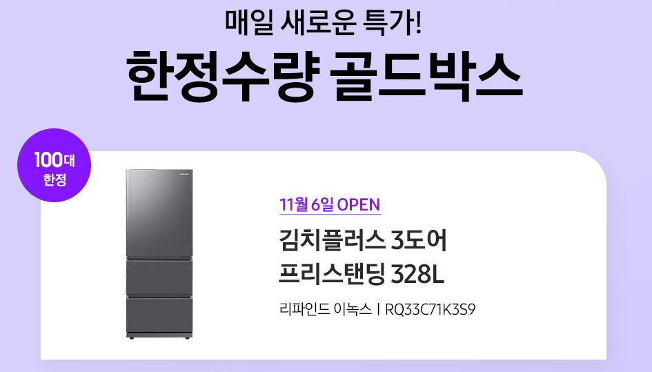 삼성전자에서 2024년 11월6일 부터 11월 12일 까지 6일간 빅세일 위크 주간으로 초특가 할인 프로모션에 들어갔습니다. 이번 11월 6일 오픈 할인 프로모션 행사로 삼성 김치냉장고는 모두 100대 한정 수량으로 재고가 조기 소진 시 구매하기 힘드니 서두르시기 바랍니다.