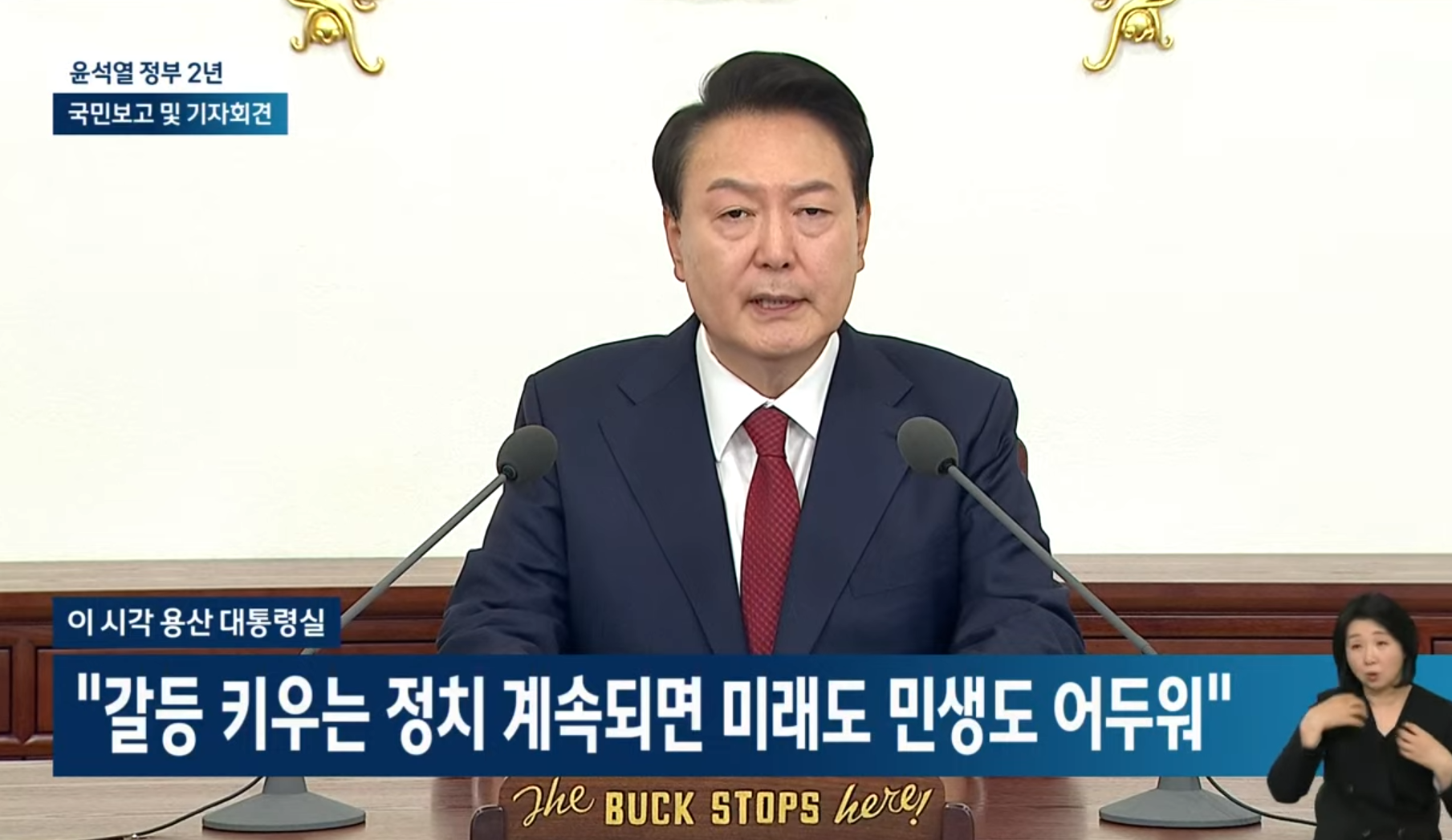 현재 윤석열 대통령이 국정 2년 국민보고 및 기자회견 방송에서 책상에 있는 "The buck stops here" 라는 문구가 적힌 나무 팻말이 있는데 이건 무엇을 의미하는 것일까요?