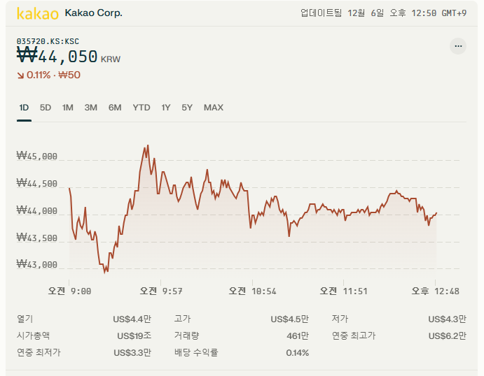 카카오의 현재 주가는 44,050원입니다. 전일 종가 대비 50원(-0.11%) 하락했습니다.