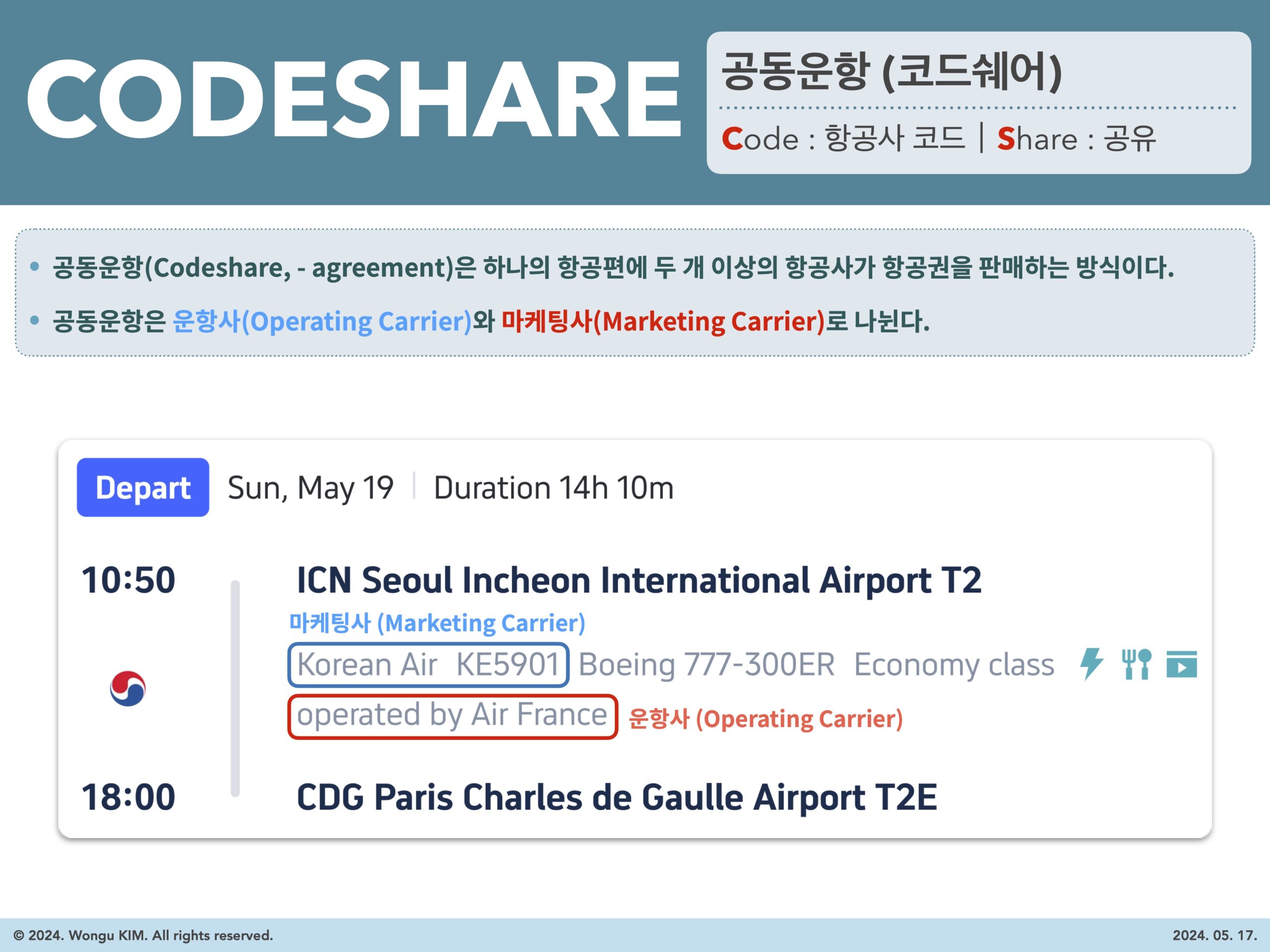 - 하나의 항공편에 두 개 이상의 항공사 코드가 적용되기 때문에 항공권 선택의 폭이 넓어지고 다양한 혜택을 누릴 수 있습니다.