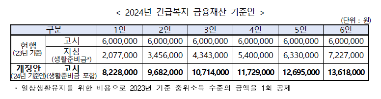 2024년 긴급복지 금융재산 기준안