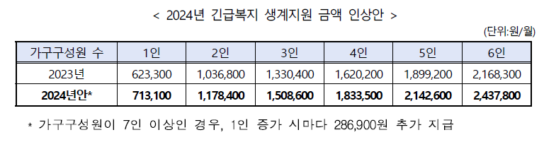 2024년 긴급복지 생계지원 금액 인상안