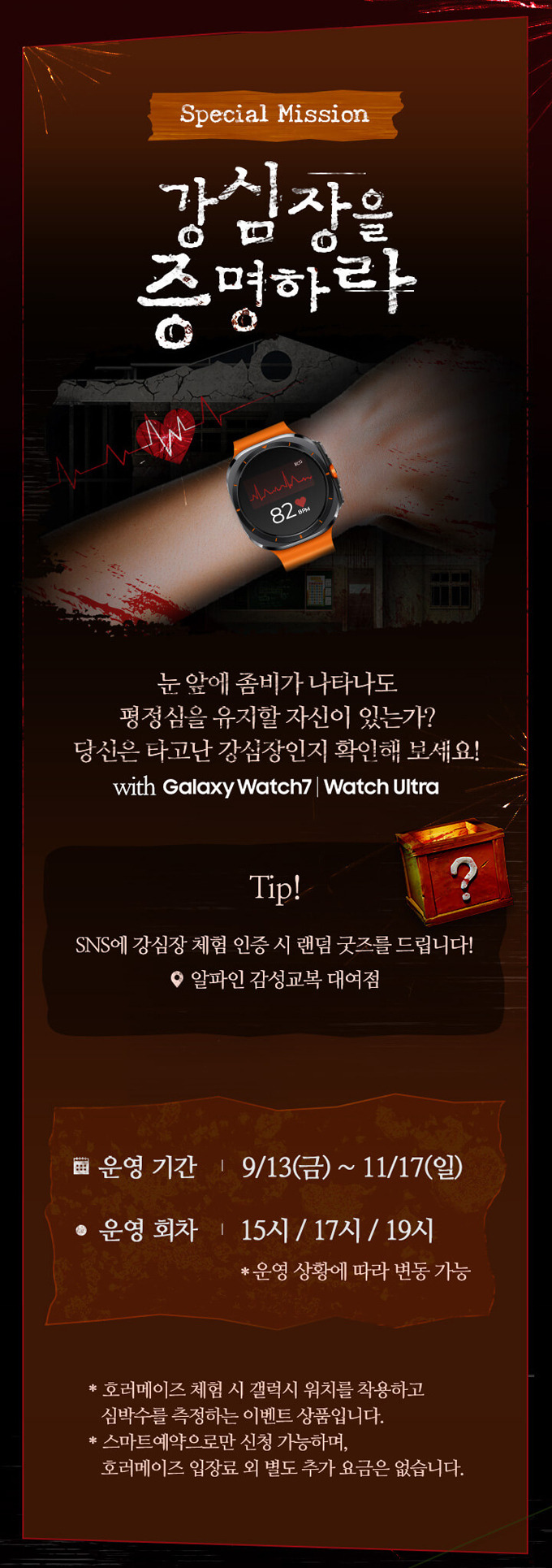마지막으로, 호러메이즈는 어두운 환경에서 진행되므로, 심장 질환이 있는 분들은 참여를 자제해 주시기 바랍니다.