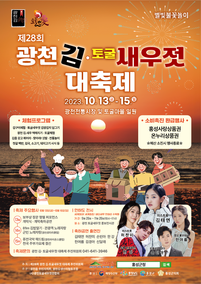- 주요 프로그램: 새우젓 담그기 체험, 광천김 만들기 체험, 토굴새우젓 시식, 김밥 만들기 대회 등이 열리며, 지역 주민과 관광객들이 함께 참여할 수 있는 다채로운 체험 행사들이 준비되어 있습니다 .
