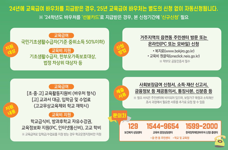 - 초·중·고 교육비: 방과후학교 자유수강권, 교재비 등이 지원됩니다.