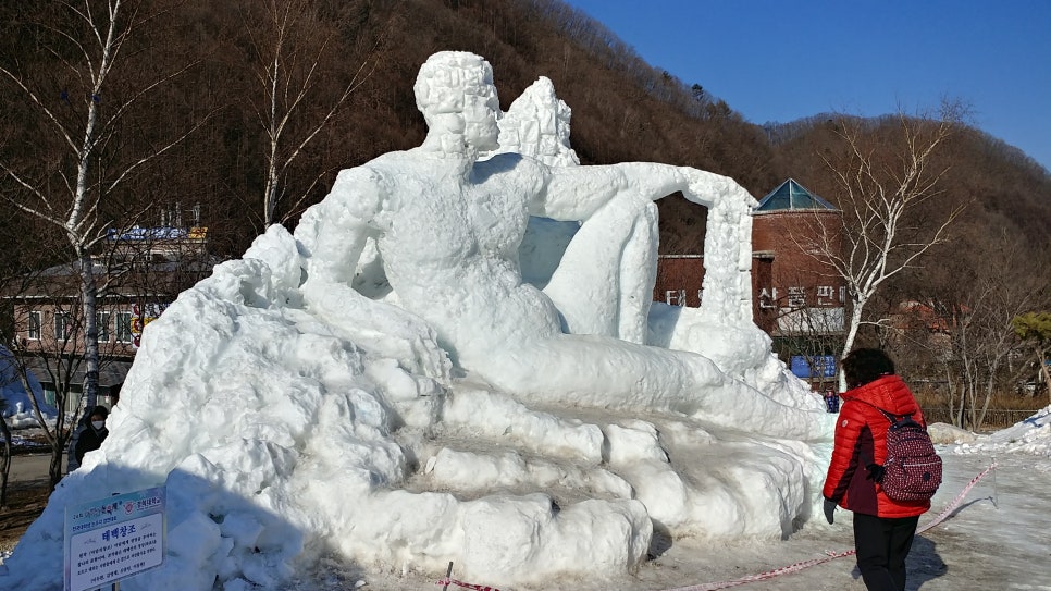태백산 눈축제의 첫 번째 포토존은 바로 대형 눈 조각 공원입니다. 이곳에서는 다양한 주제의 눈 조각들이 전시되는데, 특히 스피드와 역동성을 표현한 대형 눈 조각들이 큰 주목을 받고 있습니다. 대표 작품으로는 달리는 인물 조각이 있는데요, 마치 겨울 스포츠 선수처럼 생생한 동작을 담아내어 사진을 찍으면 내가 겨울 스포츠의 주인공이 된 듯한 느낌을 받을 수 있습니다.